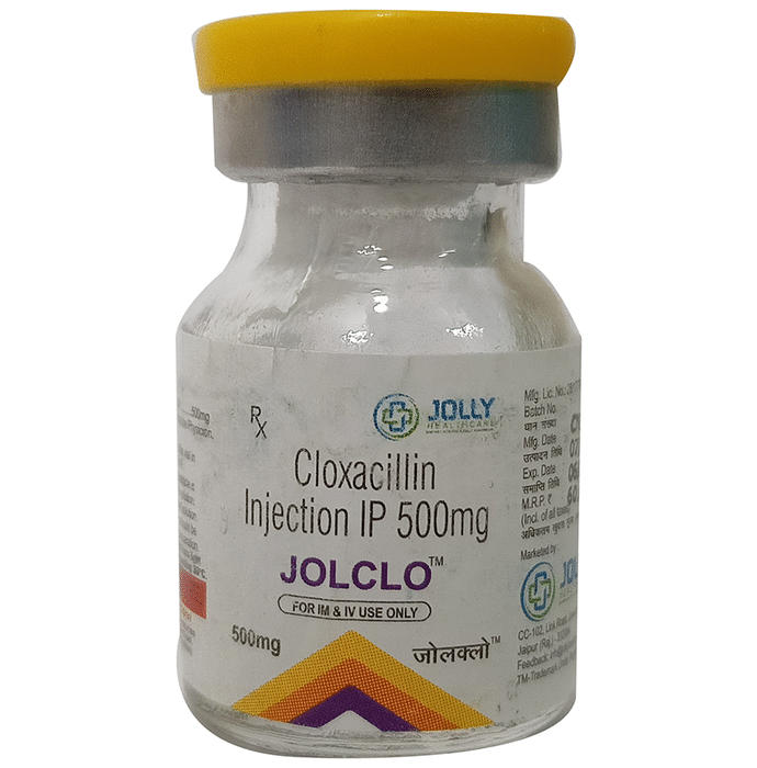 Jolclo 500mg Injection is an antibiotic used to treat a variety of bacterial infections. It is effective in infections of the throat, ear, nasal sinuses, respiratory tract, skin and soft tissue, bones and joints, and blood. Jolclo 500mg Injection is a penicillin-type of antibiotic, which mainly fights and stops the growth of the gram-positive type of bacteria. It is given as a drip (intravenous infusion) or as an injection directly into a vein or a muscle under the supervision of a healthcare professional. This medicine should be used regularly at evenly spaced intervals as per the schedule prescribed by your doctor. Do not skip any doses and finish the full course of treatment even if you feel better. Stopping the medicine too early may lead to the infection returning or worsening. The total duration of treatment and precise dosage will be decided by your doctor, depending on the type of infection that you have and how well you respond to the medication. Before taking this medicine, inform your doctor if you are allergic to penicillin or penicillin-type of medicine. Rash, allergic reactions, and local pain, swelling, redness at the site of injection may be seen as side effects in some patients. These are temporary and usually resolve quickly. Consult your doctor if any of these side effects persist or if your condition worsens. This medicine is generally regarded as safe to use during pregnancy if used under a doctor’s supervision.