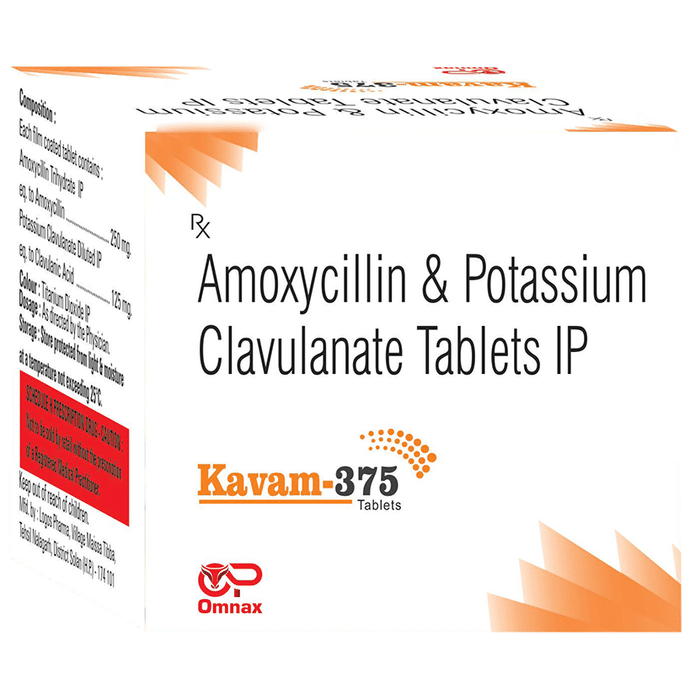 Kavam 375 Tablet is a penicillin-type of antibiotic that helps your body fight infections caused by bacteria. It is used to treat infections of the lungs (e.g., pneumonia), ear, nasal sinus, urinary tract, skin, and soft tissue. It will not work for viral infections such as the common cold. Kavam 375 Tablet is best taken with a meal to reduce the chance of a stomach upset. You should take it regularly at evenly spaced intervals as per the schedule prescribed by your doctor. Taking it at the same time every day will help you to remember to take it. The dose will depend on what you are being treated for, but you should always complete a full course of this antibiotic as prescribed by your doctor. Do not stop taking it until you have finished, even when you feel better. If you stop taking it early, some bacteria may survive and the infection may come back or worsen. The most common side effects of this medicine include vomiting, nausea, and diarrhea. These are usually mild but let your doctor know if they bother you or will not go away. Before taking it, let your doctor know if you are allergic to any antibiotics or have any kidney or liver problems. You should also let your healthcare team know about all other medicines you are taking as they may affect, or be affected by, this medicine. This medicine is generally regarded as safe to use during pregnancy and breastfeeding if prescribed by a doctor.
