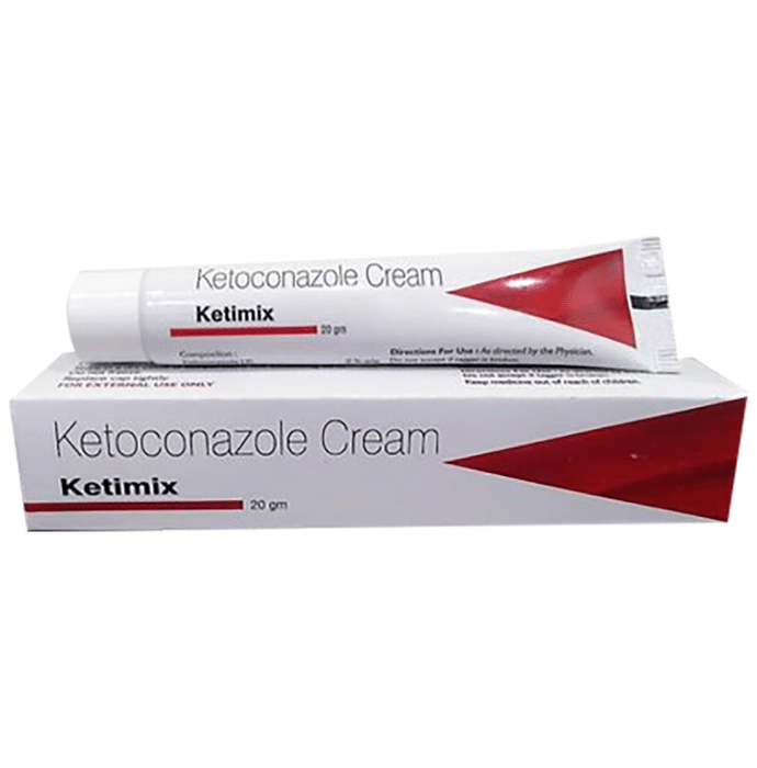 Ketimix Cream belongs to a group of medicines called antifungals. It is used to treat fungal infections of the skin. It works by killing the fungus that causes infections such as athlete’s foot, thrush and ringworm. Ketimix Cream should be used in the dose and duration as prescribed by your doctor. This medicine should be used regularly to get the maximum benefit from it. Do not use more than you need, it will not clear your condition faster and may only increase the side effects. Skin infections will usually get better after 2 to 4 weeks. Do not use the medicine for longer than your doctor has told you to and let him or her know if your condition does not improve after 2 to 4 weeks of treatment. If you have Athlete’s foot, wash your socks or tights thoroughly and change your shoes daily if possible. The most common side effects of using this medicine include application site reactions (burning, irritation, itching, and redness), dryness, peeling, or blistering of the skin. Occasionally it can cause thinning of your hair. These are not usually serious, but you should call your doctor if you think you might have a severe allergic reaction. Signs of this include rash, swelling of the lips, throat or face, swallowing, or breathing problems. Get emergency help if this happens. Avoid direct contact with your eyes. In the case of direct contact, wash your eyes with water, and seek immediate medical attention. It is not likely that other medicines you take by mouth or injection will affect the way this medicine works, but talk to your doctor before using it if you have recently used another medicine that contains a steroid or had an allergic reaction to another antifungal medicine. For pregnant or breastfeeding women, this cream should only be used if it is clearly needed.
