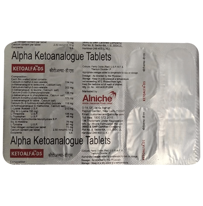 Ketoalfa-DS Tablet is a nutritional supplement used in the treatment of chronic kidney disease. It reduces urea levels in the blood and helps prevent the progression of kidney disease. This way it delays the risk of undergoing long-term dialysis. Ketoalfa-DS Tablet is to be taken by mouth with or without food. Take it in the exact dose and duration as advised by the doctor. Taking it along with a low-protein diet may help get the best of the medicine. Ensure that you maintain adequate calorie intake during treatment. While you are taking this medicine, your doctor may advise regular monitoring of serum calcium levels. This medicine is usually well tolerated with no common side effects. Ensure regular doctor consultation to evaluate medicine effects on your body. Before taking Ketoalfa-DS Tablet, it is important to tell your doctor if you are taking any other medicines for other health conditions.