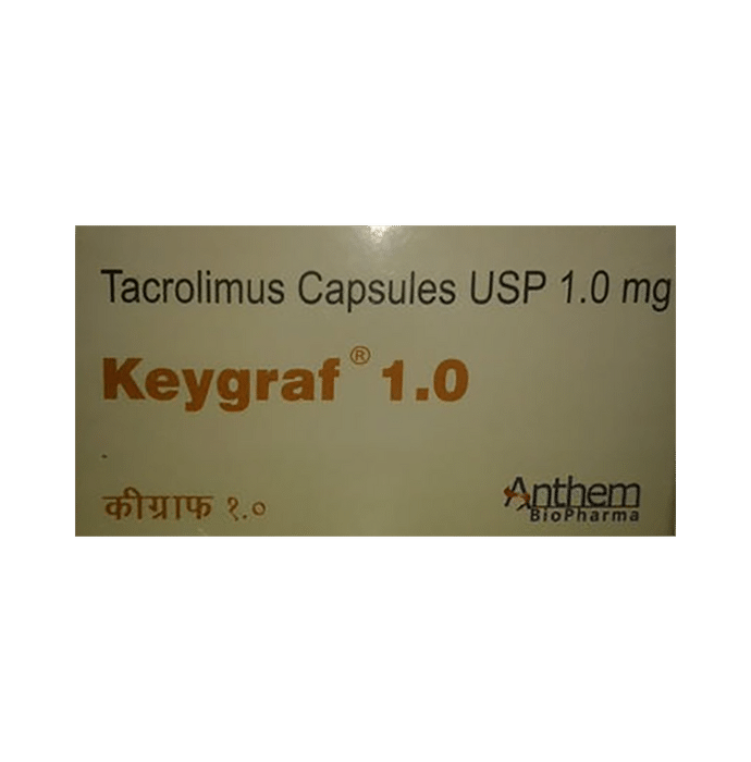 Keygraf 1 Capsule is used along with other medicines to prevent your body from rejecting a new organ (e.g., liver, kidney, or heart) after transplant. It does so by weakening your body’s immune system, so it does not attack the new organ. This medication belongs to a class of drugs known as immunosuppressants. The amount of Keygraf 1 Capsule you take and how often you take it depends on the type of transplant you have, your body weight, and what other medicines you are taking. Follow your doctor’s instructions carefully. You should take it on an empty stomach, at least 1 hour before or 2 hours after a meal. Take this medicine regularly to get the maximum benefit and keep taking it, even if you feel well. If you stop taking it, you may increase the chances of rejecting your transplanted organ. Keygraf 1 Capsule has many potential side effects. It can cause or worsen diabetes and kidney and liver problems. These need urgent medical attention. Other common side effects include nausea, stomach pain, diarrhea, and difficulty sleeping. If the side effects do not go away or get worse, tell your doctor. Keygraf 1 Capsule lowers your immune system making you susceptible to catching more infections than usual. Before taking this medicine, tell your doctor if you have kidney, liver, or heart problems, diabetes, or high blood pressure. Also let your doctor know what other medications you are taking, especially for infections, pain, and arthritis. These and others may affect, or be affected by, this medicine. You should limit your exposure to the sun and UV (ultraviolet) light while taking it because immunosuppressants could increase your risk of skin cancer. Both men and women using this medicine should use effective birth control to prevent pregnancy. This medicine is not normally recommended during pregnancy or while breastfeeding unless it is clearly needed. Before and during treatment you will need frequent medical tests to monitor your progress, and your blood pressure will need to be checked often.