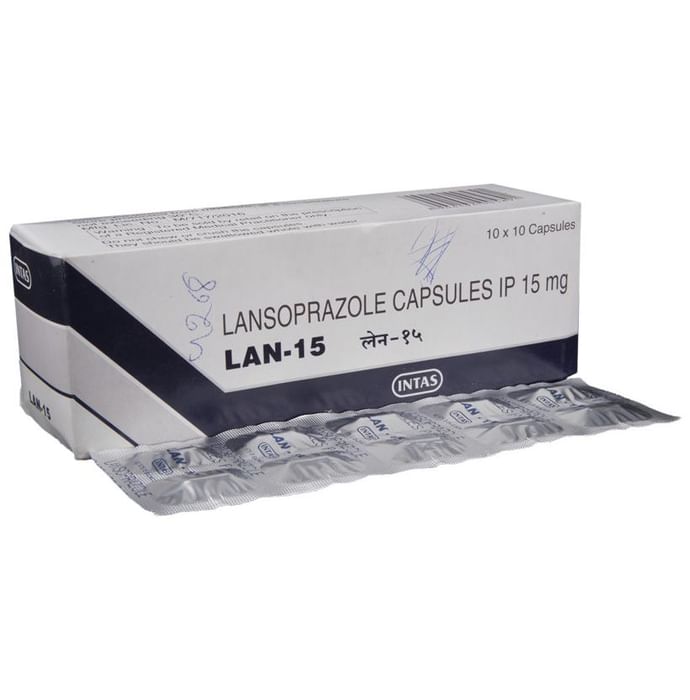 LAN 15 Capsule is a medicine that reduces the amount of acid produced in your stomach. It is used for treating acid-related diseases of the stomach and intestine such as acid reflux, peptic ulcer disease, and some other stomach conditions associated with excessive acid production. LAN 15 Capsule is also used to prevent stomach ulcers and acidity that may be seen with the prolonged use of painkillers. It belongs to a class of medicines known as proton pump inhibitors (PPIs). This medicine should be taken one hour before a meal, preferably in the morning. The dose will depend on your underlying condition and how you respond to the medicine. You should keep on taking it as prescribed even if your symptoms disappear quickly. You can increase the efficiency of the treatment by eating smaller meals more often and avoiding caffeinated drinks (like tea and coffee), and spicy or fatty foods. The most common side effects observed with this medicine include nausea, headache, flatulence, and diarrhea. These symptoms are generally mild but if they bother you or do not go away, consult your doctor. Long-term use of this medicine may lead to an increased risk of side effects. For instance, using this medicine for more than 1 year may increase your risk for bone fractures, especially with higher doses. Talk to your doctor about ways to prevent bone loss (osteoporosis), like taking calcium and vitamin D supplements. Before taking this medicine, you need to tell your doctor if you have severe liver problems, are taking medicines for HIV, have ever had an allergic reaction to similar medicines in the past, or suffer from bone loss (osteoporosis). Pregnant or breastfeeding women should also consult their doctor before taking it.