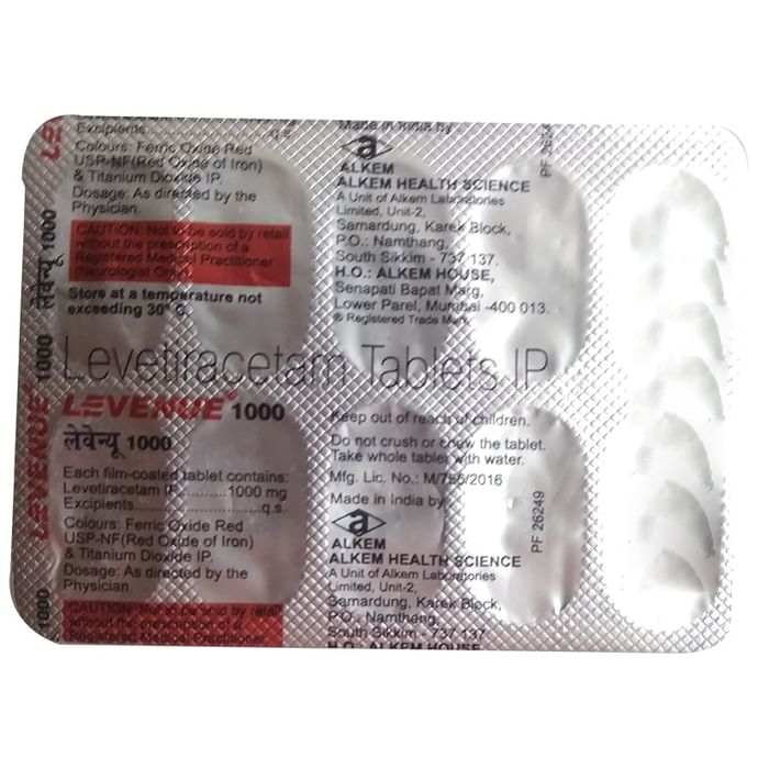 Levenue 1000 Tablet is an anti-epileptic medicine used to treat seizures (fits) in epilepsy. It can be used alone or along with other medicines. It helps to prevent seizures for as long as you continue to take it. Levenue 1000 Tablet suppresses the abnormal electrical activity in the brain. You can take it with or without food but try to take it at the same time each day to get the most benefit. The dose will depend on your condition and how you respond to the medicine. Your doctor will advise the right dose for you. It is generally advised as a long-term treatment. You should continue taking it for as long as your doctor has told you to, even if you feel well. If you stop or miss doses your seizures could get worse. Some common side effects of this medicine include dizziness, headache, infection, irritation, nasal congestion (stuffy nose), sleepiness, behavior changes, aggressive behavior, and decreased appetite. Side effects are more common during the first few weeks and usually lessen as your body gets used to the medicine. Most of these side effects do not need medical attention, but some of them can be serious. A small number of people being treated with this medicine have had thoughts of harming or killing themselves. Contact your doctor if your mood changes for the worse. Before taking it, you should tell your doctor if you have kidney problems, depression, or suicidal thoughts and if you are pregnant, planning to become pregnant, or breastfeeding. Your doctor may suggest regular blood tests to monitor your kidney function while taking this medicine.