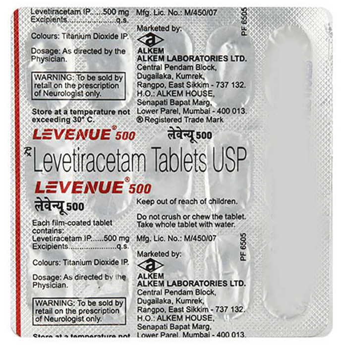 Levenue 500 Tablet is an anti-epileptic medicine used to treat seizures (fits) in epilepsy. It can be used alone or along with other medicines. It helps to prevent seizures for as long as you continue to take it. Levenue 500 Tablet suppresses the abnormal electrical activity in the brain. You can take it with or without food but try to take it at the same time each day to get the most benefit. The dose will depend on your condition and how you respond to the medicine. Your doctor will advise the right dose for you. It is generally advised as a long-term treatment. You should continue taking it for as long as your doctor has told you to, even if you feel well. If you stop or miss doses your seizures could get worse. Some common side effects of this medicine include dizziness, headache, infection, irritation, nasal congestion (stuffy nose), sleepiness, behavior changes, aggressive behavior, and decreased appetite. Side effects are more common during the first few weeks and usually lessen as your body gets used to the medicine. Most of these side effects do not need medical attention, but some of them can be serious. A small number of people being treated with this medicine have had thoughts of harming or killing themselves. Contact your doctor if your mood changes for the worse. Before taking it, you should tell your doctor if you have kidney problems, depression, or suicidal thoughts and if you are pregnant, planning to become pregnant, or breastfeeding. Your doctor may suggest regular blood tests to monitor your kidney function while taking this medicine.