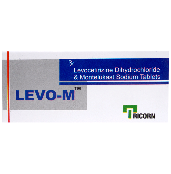 Levo-M Tablet is a combination medicine used in the treatment of allergic symptoms such as runny nose, stuffy nose, sneezing, itching, swelling, watery eyes and congestion or stuffiness. It also reduces inflammation in the airways and make breathing easier. Levo-M Tablet is taken with or without food in a dose and duration as advised by the doctor. The dose you are given will depend on your condition and how you respond to the medicine. You should keep taking this medicine for as long as your doctor recommends. If you stop treatment too early your symptoms may come back and your condition may worsen. Let your healthcare team know about all other medications you are taking as some may affect, or be affected by this medicine. The most common side effects are nausea, diarrhea, vomiting, dryness in the mouth, headache, skin rash, flu-like symptoms, and fatigue. Most of these are temporary and usually resolve with time. Contact your doctor straight away if you are at all concerned about any of these side effects. This medicine may cause dizziness and sleepiness, so do not drive or do anything that requires mental focus until you know how this medicine affects you. Avoid drinking alcohol while taking this medicine as it can worsen your sleepiness. Never support self-medication or recommend your medicine to another person. It is beneficial to have plenty of fluids while taking this medication. Before you start taking this medicine it is important to inform your doctor if you are suffering from kidney disease.