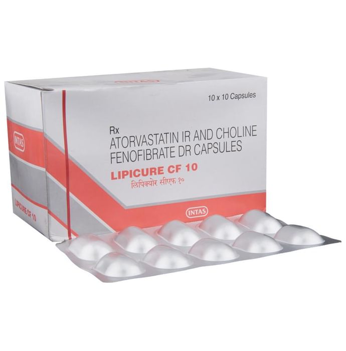 Lipicure CF 10 Capsule IR is a combination of two lipids (fat) lowering medicines. It is used to lower the levels of lipids known as cholesterol and triglycerides in the blood when lifestyle changes (eg. low-fat diet) on their own have failed. This medicine helps to reduce the risk of heart disease. Lipicure CF 10 Capsule IR can be taken with a meal or on an empty stomach. You can take it at any time of the day but try to take it at the same time each day. This will help you remember to take it. Your doctor will prescribe the right dose depending on your lipid levels and how you respond to this medicine. Most people with high cholesterol and triglyceride do not feel ill, but stopping your medicine may increase your lipid levels, making your condition worse and increasing your risk of heart disease and stroke. It is important to have your cholesterol and triglyceride levels (lipid profile) checked regularly. This medicine is only one part of a treatment program which should also include a healthy low-fat diet, regular exercise, smoking cessation, moderation of alcohol intake, and weight reduction. You can eat normally while taking this medicine, but try to avoid foods that are high in fat. Nausea, stomach pain, constipation, headache, flatulence (excessive gas), and muscle pain are some of the common side effects of this medicine. These are usually mild and disappear after a short time. Consult your doctor if they persist or if you notice any yellowing of your eyes, unusual bleeding or bruising, or get repeated, severe, or unexplained muscle pains. You may be advised to get your liver function tested periodically while taking this medicine. This medicine should not be used in conditions such as liver disease (eg. abnormal blood tests for liver function, persistent yellowness of eyes, etc.). Before taking it, let your doctor know if you have any kidney-related problems or if you are pregnant, planning a pregnancy, or breastfeeding. Diabetic patients should monitor their blood sugar levels while taking this medicine, as it may lead to an increase in blood sugar levels.