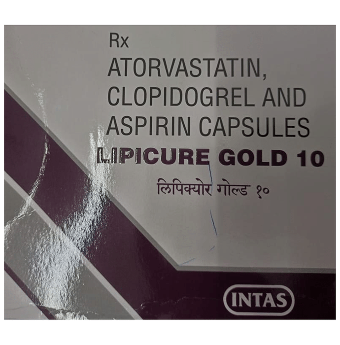 Lipicure Gold 10 Capsule is used for the prevention of heart attack. It is a combination of medicines that prevent clot formation in the blood vessels. It also helps to reduce increased cholesterol and triglycerides levels. Lipicure Gold 10 Capsule should be taken with food regularly at a fixed time each day. You should take it regularly at evenly spaced intervals as per the schedule prescribed by your doctor. Taking it at the same time every day will help you remember to take it. The dose and duration of treatment will depend on what you are being treated for. Do not stop taking it until you have finished the complete course, even when you feel better. Lifestyle changes like a low-fat diet, exercise, and not smoking may help this medicine to work better. Abdominal pain, indigestion, bruising, and nosebleeds are some common side effects of this medicine. This medicine increases your risk of bleeding, so it is important to be careful while shaving, cutting nails, and using sharp objects. Let your doctor know if you notice muscle symptoms (pain or weakness), yellowing of the skin, and dark urine. Usually, it is advisable to avoid alcohol intake while taking this medicine. Before taking this medicine, tell your doctor if you have any liver or kidney disease. You must tell your doctor if you are pregnant, planning pregnancy, or breastfeeding. You should also let your healthcare team know all other medicines you are taking as they may affect, or be affected by this medicine.