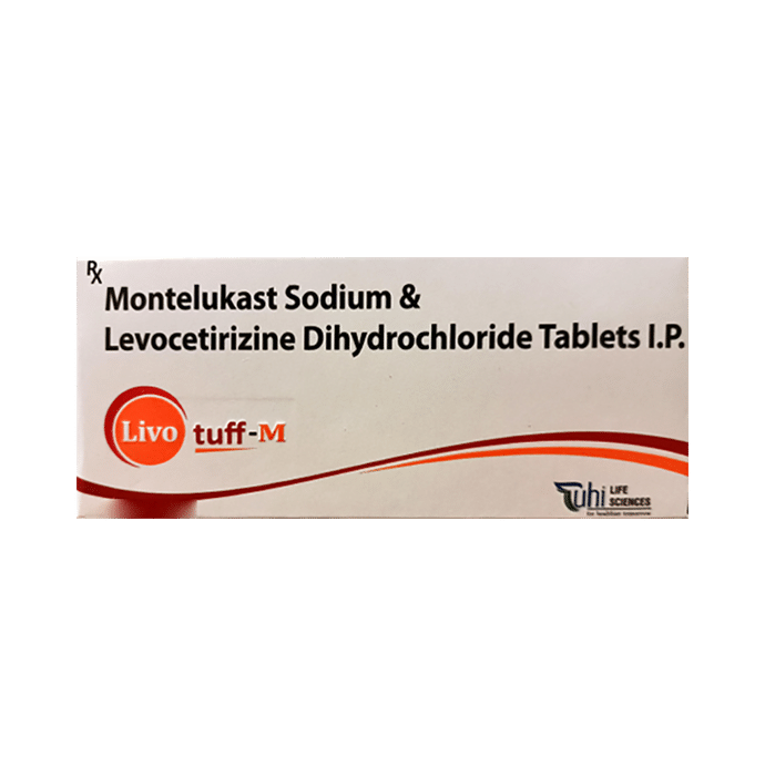 Livotuff-M Tablet is a combination medicine used in the treatment of allergic symptoms such as runny nose, stuffy nose, sneezing, itching, swelling, watery eyes and congestion or stuffiness. It also reduces inflammation in the airways and make breathing easier. Livotuff-M Tablet is taken with or without food in a dose and duration as advised by the doctor. The dose you are given will depend on your condition and how you respond to the medicine. You should keep taking this medicine for as long as your doctor recommends. If you stop treatment too early your symptoms may come back and your condition may worsen. Let your healthcare team know about all other medications you are taking as some may affect, or be affected by this medicine. The most common side effects are nausea, diarrhea, vomiting, dryness in the mouth, headache, skin rash, flu-like symptoms, and fatigue. Most of these are temporary and usually resolve with time. Contact your doctor straight away if you are at all concerned about any of these side effects. This medicine may cause dizziness and sleepiness, so do not drive or do anything that requires mental focus until you know how this medicine affects you. Avoid drinking alcohol while taking this medicine as it can worsen your sleepiness. Never support self-medication or recommend your medicine to another person. It is beneficial to have plenty of fluids while taking this medication. Before you start taking this medicine it is important to inform your doctor if you are suffering from kidney disease.