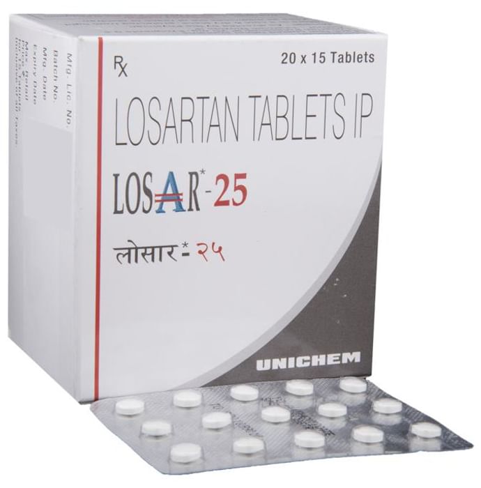 Losar 25 Tablet is a medicine used to treat high blood pressure and heart failure. Lowering blood pressure helps to prevent future heart attacks and stroke. This medicine is also effective in preserving kidney function in patients with diabetes. Losar 25 Tablet can be prescribed either alone or in combination with other medicines. It may be taken with or without food during the day or at night. However, try to take it at the same time each day to get the most benefit. It is important to continue taking it regularly even if you feel well or if your blood pressure is controlled. Most people with high blood pressure do not feel ill, but if you stop taking this medicine, your condition could get worse. This is a widely used medicine and is considered safe for long-term use. Making some changes in your lifestyle will also help lower your blood pressure. These may include regular exercise, losing weight, smoking cessation, reducing alcohol intake, and reducing the amount of salt in your diet as advised by your doctor. This medicine is tolerated well by most patients and has few side effects. Dizziness, particularly after the first dose, is known to occur in some people. This may be associated with headaches. Let your doctor know if these side effects bother you or do not go away. Before taking this medicine, let your doctor know if you have any kidney or liver problems. Pregnant or breastfeeding mothers should also consult their doctor before taking it. Your doctor may check your kidney function, blood pressure, and potassium levels in your blood at regular intervals while you are taking this medicine.