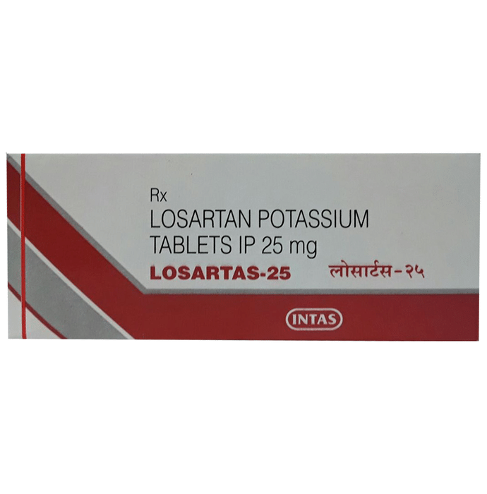 Losartas 25 Tablet is a medicine used to treat high blood pressure and heart failure. Lowering blood pressure helps to prevent future heart attacks and stroke. This medicine is also effective in preserving kidney function in patients with diabetes. Losartas 25 Tablet can be prescribed either alone or in combination with other medicines. It may be taken with or without food during the day or at night. However, try to take it at the same time each day to get the most benefit. It is important to continue taking it regularly even if you feel well or if your blood pressure is controlled. Most people with high blood pressure do not feel ill, but if you stop taking this medicine, your condition could get worse. This is a widely used medicine and is considered safe for long-term use. Making some changes in your lifestyle will also help lower your blood pressure. These may include regular exercise, losing weight, smoking cessation, reducing alcohol intake, and reducing the amount of salt in your diet as advised by your doctor. This medicine is tolerated well by most patients and has few side effects. Dizziness, particularly after the first dose, is known to occur in some people. This may be associated with headaches. Let your doctor know if these side effects bother you or do not go away. Before taking this medicine, let your doctor know if you have any kidney or liver problems. Pregnant or breastfeeding mothers should also consult their doctor before taking it. Your doctor may check your kidney function, blood pressure, and potassium levels in your blood at regular intervals while you are taking this medicine.