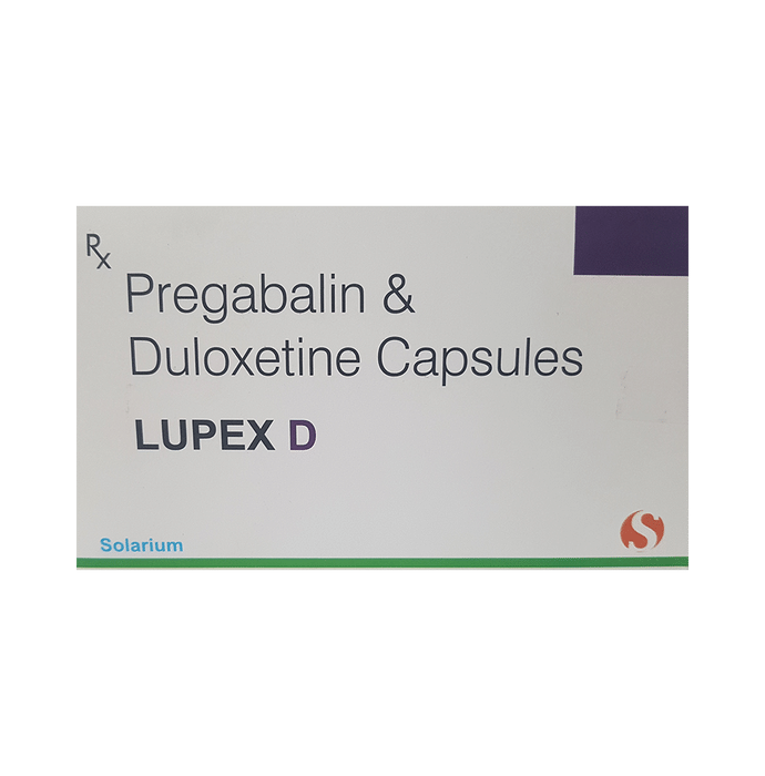 Lupex D Capsule is used for the treatment of neuropathic pain. It decreases pain by controlling calcium channel activity of the nerve cells. It also increases the level of chemical messengers in the brain that helps maintain mental balance and stop the movement of pain signals in the brain. Lupex D Capsule can be taken with or without food. However, it is advised to take it at the same time each day as this helps to maintain a consistent level of medicine in the body. Take this medicine in the dose and duration advised by your doctor as this is habit forming medicine. If you miss a dose of this medicine, take it as soon as you remember. Finish the full course of the treatment even if you feel better. It is important not to stop taking this medicine suddenly as it may worsen your symptoms. Some common side effects of this medicine include peripheral edema, nausea, headache, dryness of mouth, difficulty in concentration and blurred vision. It may cause dizziness and sleepiness, so do not drive or do anything that requires mental focus until you know how this medicine affects you. This medicine may cause weight gain and to control it, you should have a balanced diet and exercise regularly. It is important to inform your doctor if you develop any unusual changes in mood or behavior, new or worsening depression, or suicidal thoughts. Before taking this medicine let your doctor know if you suffer from kidney or liver disease. Your doctor should also know about all other medicines you are taking as many of these may make this medicine less effective or change the way it works. Inform your doctor if you are pregnant, planning pregnancy or breastfeeding.