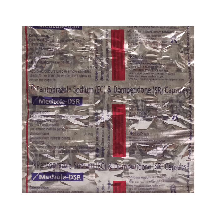 Medzole-DSR Capsule is a prescription medicine used to treat gastroesophageal reflux disease (Acid reflux) and peptic ulcer disease by relieving the symptoms of acidity such as indigestion, heartburn, stomach pain, or irritation. Medzole-DSR Capsule also neutralizes the acid in the stomach and promotes easy passage of gas to reduce stomach discomfort. It is taken without food in a dose and duration as advised by the doctor. The dose you are given will depend on your condition and how you respond to the medicine. You should keep taking this medicine for as long as your doctor recommends. If you stop treatment too early your symptoms may come back and your condition may worsen. Let your healthcare team know about all other medications you are taking as some may affect, or be affected by this medicine. The most common side effects are diarrhea, stomach pain, flatulence, dryness in the mouth, and headache. Most of these are temporary and usually resolve with tdime. Contact your doctor straight away if you are at all concerned about any of these side effects. This medicine may cause dizziness and sleepiness, so do not drive or do anything that requires mental focus until you know how this medicine affects you. Avoid drinking alcohol while taking this medicine as it can worsen your sleepiness. Lifestyle modifications like having cold milk and avoiding hot tea, coffee, spicy food, or chocolate can help you to get better results. Before you start taking this medicine it is dimportant to inform your doctor if you are suffering from kidney or liver disease. You should also tell your doctor if you are pregnant, planning pregnancy, or breastfeeding.