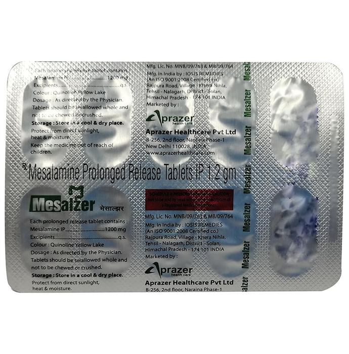 Mesalzer Tablet PR is an anti-inflammatory medicine used to treat a type of bowel disease known as ulcerative colitis. It helps to reduce symptoms such as diarrhea, bleeding and stomach pain by reducing inflammation in the bowel. Mesalzer Tablet PR may also be used to treat another type of bowel disease known as Crohn’s ileocolitis. It should be taken with food. The dose will depend on what you are being treated for but take it exactly as your doctor prescribes. You should keep taking this medicine for as long as your doctor recommends. If you stop treatment too early your symptoms may come back and your condition may worsen. The most common side effects of this medicine include nausea, diarrhea, stomach pain, headache, itching, flatulence, vomiting, dizziness, joint pain, and muscle pain. If these symptoms bother you, do not go away, or get worse, let your doctor know. There may be ways of reducing or preventing them. Some people may get a severe allergic reaction that needs urgent medical attention. Contact your doctor immediately if you notice symptoms like swelling of the face, tongue, throat, or lips, unusual bleeding, bruising, rash, fever, sore throat, or excessive tiredness. Before taking it, tell your doctor if you have any kidney or liver problems or a blockage in your stomach. Your age may also be a factor in deciding whether this medicine is suitable. Pregnant or breastfeeding women should also consult their doctor before taking this medicine. Let your doctor know about all other medications you are taking as some may affect, or be affected by this medicine.