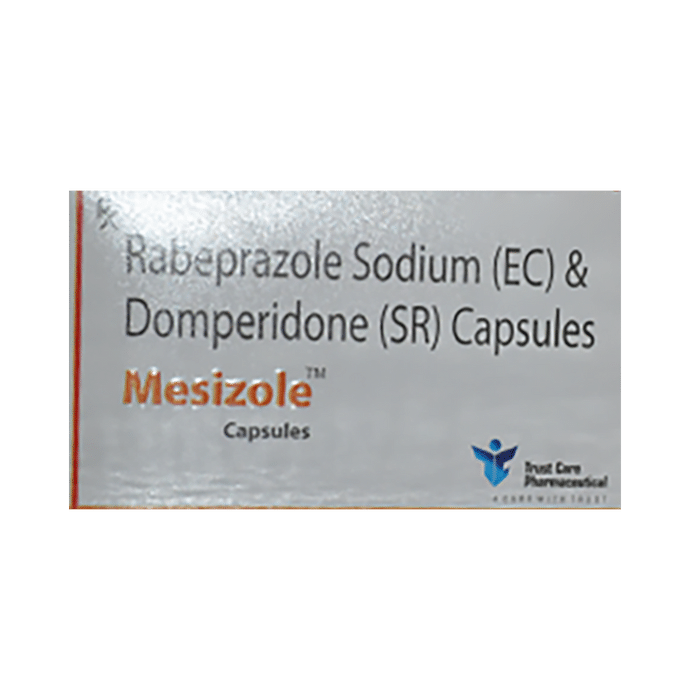 Mesizole Capsule SR is a combination medicine used to treat gastroesophageal reflux disease (Acid reflux) and peptic ulcer disease by relieving the symptoms of acidity such as heartburn, stomach pain, or irritation. It also neutralizes the acid and promotes easy passage of gas to reduce stomach discomfort. Mesizole Capsule SR is taken without food in a dose and duration as advised by the doctor. The dose you are given will depend on your condition and how you respond to the medicine. You should keep taking this medicine for as long as your doctor recommends. If you stop treatment too early your symptoms may come back and your condition may worsen. Let your healthcare team know about all other medications you are taking as some may affect, or be affected by this medicine. The most common side effects are diarrhea, stomach pain, dryness in mouth, headache, flatulence, and weakness. Most of these are temporary and usually resolve with tdime. Contact your doctor straight away if you are at all concerned about any of these side effects. This medicine may cause dizziness and sleepiness, so do not drive or do anything that requires mental focus until you know how this medicine affects you. Avoid drinking alcohol while taking this medicine as it can worsen your sleepiness. Lifestyle modifications like having cold milk and avoiding hot tea, coffee, spicy food or chocolate can help you to get better results. Before you start taking this medicine it is dimportant to inform your doctor if you are suffering from kidney or liver disease. You should also tell your doctor if you are pregnant, planning pregnancy or breastfeeding.
