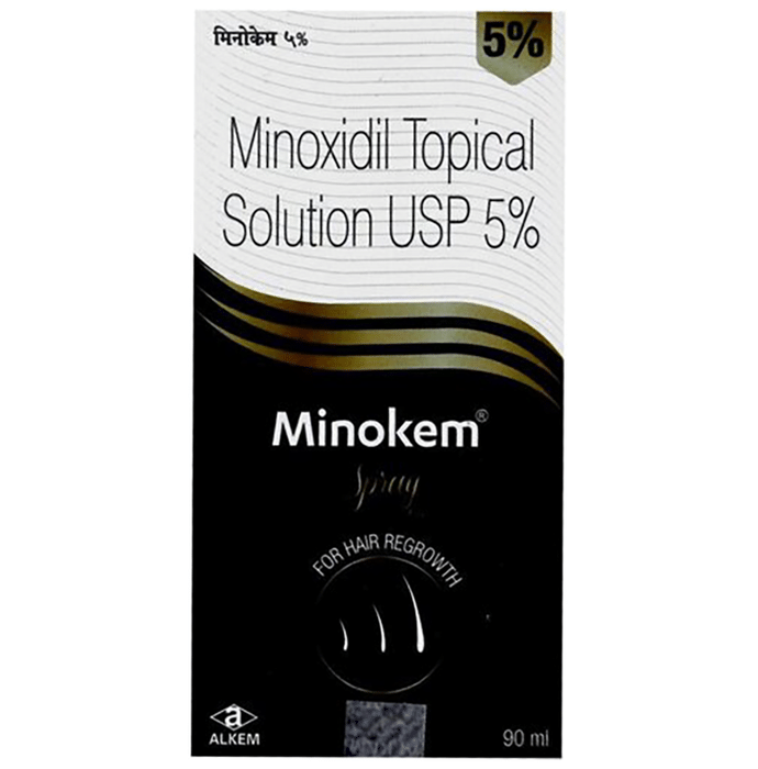 Minokem 5% Spray belongs to a class of drugs known as vasodilators. It is used to promote hair growth in men with male pattern baldness. Minokem 5% Spray should only be applied directly to the scalp area in the amount and in the way specified on the label or by your doctor. Clean and dry your scalp before using it. It may take approxdimately 2- 4 months before you notice any hair growth. The first growth may be soft, colourless, and barely visible. Using more than recommended will not speed up hair growth and may increase the likelihood of side effects. This medication must be used continuously to maintain hair growth. Tell your doctor if your condition does not dimprove or worsen after using it for 4 to 6 months. Minokem 5% Spray is generally safe and suitable for most people but may have potential side effects. The most common side effects of this medicine are itching and skin irritation of the treated area of the scalp. In case of accidental application in other areas, it may result in unwanted hair growth. Rinse thoroughly with plenty of water if you get it in your eyes, mouth, or broken skin. Talk to your doctor if you are bothered by the side effects or if they do not go away. People under 18 or over 65 should not usually use Minokem 5% Spray. It may also not be appropriate if your hair loss is due to medications (such as chemotherapy) or any nutritional deficiency. You should also not use this medicine if you have high blood pressure or use other creams or lotions to treat other scalp conditions. Talk to your doctor if you have heart disease or blood circulation problems.