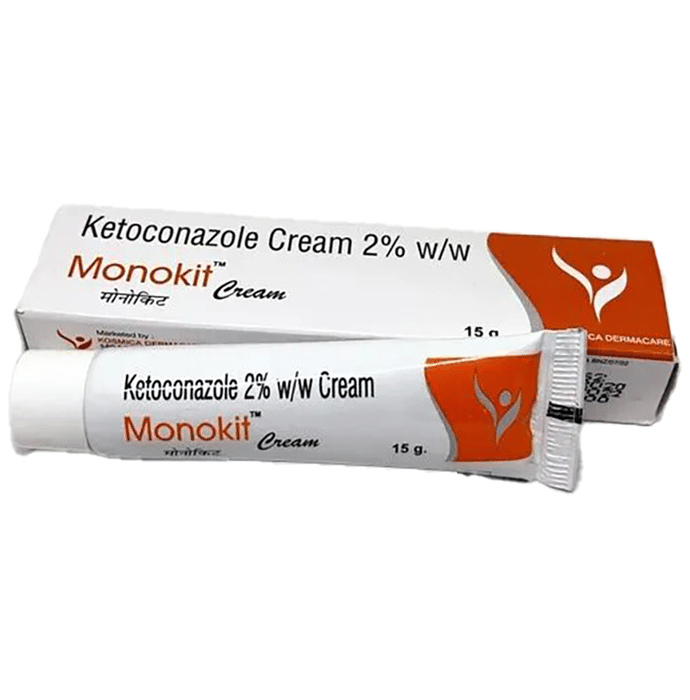 Monokit Cream belongs to a group of medicines called antifungals. It is used to treat fungal infections of the skin. It works by killing the fungus that causes infections such as athlete’s foot, thrush and ringworm. Monokit Cream should be used in the dose and duration as prescribed by your doctor. This medicine should be used regularly to get the maximum benefit from it. Do not use more than you need, it will not clear your condition faster and may only increase the side effects. Skin infections will usually get better after 2 to 4 weeks. Do not use the medicine for longer than your doctor has told you to and let him or her know if your condition does not improve after 2 to 4 weeks of treatment. If you have Athlete’s foot, wash your socks or tights thoroughly and change your shoes daily if possible. The most common side effects of using this medicine include application site reactions (burning, irritation, itching, and redness), dryness, peeling, or blistering of the skin. Occasionally it can cause thinning of your hair. These are not usually serious, but you should call your doctor if you think you might have a severe allergic reaction. Signs of this include rash, swelling of the lips, throat or face, swallowing, or breathing problems. Get emergency help if this happens. Avoid direct contact with your eyes. In the case of direct contact, wash your eyes with water, and seek immediate medical attention. It is not likely that other medicines you take by mouth or injection will affect the way this medicine works, but talk to your doctor before using it if you have recently used another medicine that contains a steroid or had an allergic reaction to another antifungal medicine. For pregnant or breastfeeding women, this cream should only be used if it is clearly needed.