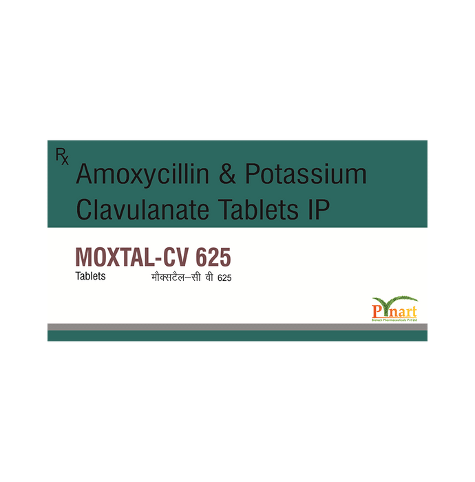 Moxtal-CV 625 Tablet is a penicillin-type of antibiotic that helps your body fight infections caused by bacteria. It is used to treat infections of the lungs (e.g., pneumonia), ear, nasal sinus, urinary tract, skin, and soft tissue. It will not work for viral infections such as the common cold. Moxtal-CV 625 Tablet is best taken with a meal to reduce the chance of a stomach upset. You should take it regularly at evenly spaced intervals as per the schedule prescribed by your doctor. Taking it at the same time every day will help you to remember to take it. The dose will depend on what you are being treated for, but you should always complete a full course of this antibiotic as prescribed by your doctor. Do not stop taking it until you have finished, even when you feel better. If you stop taking it early, some bacteria may survive and the infection may come back or worsen. The most common side effects of this medicine include vomiting, nausea, and diarrhea. These are usually mild but let your doctor know if they bother you or will not go away. Before taking it, let your doctor know if you are allergic to any antibiotics or have any kidney or liver problems. You should also let your healthcare team know about all other medicines you are taking as they may affect, or be affected by, this medicine. This medicine is generally regarded as safe to use during pregnancy and breastfeeding if prescribed by a doctor.