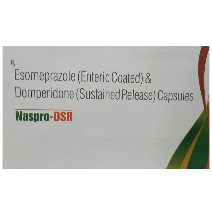 Naspro-DSR Capsule is a prescription medicine used to treat gastroesophageal reflux disease (Acid reflux) and indigestion by relieving the symptoms such as heartburn, stomach pain, or irritation. It also neutralizes the acid in the stomach and promotes easy passage of gas to reduce stomach discomfort. Naspro-DSR Capsule is taken without food in a dose and duration as advised by the doctor. The dose you are given will depend on your condition and how you respond to the medicine. You should keep taking this medicine for as long as your doctor recommends. If you stop treatment too early your symptoms may come back and your condition may worsen. Let your healthcare team know about all other medications you are taking as some may affect, or be affected by this medicine. Most common side effects are diarrhea, flatulence, stomach pain, dryness in mouth, and headache. Most of these are temporary and usually resolve with time. Contact your doctor straight away if you are at all concerned about any side effects. It may also cause sleepiness and dizziness, so do not drive or do anything that requires mental focus until you know how this medicine affects you. Avoid drinking alcohol while taking this medicine as it can worsen your sleepiness. Lifestyle modifications like having cold milk and avoiding hot tea, coffee, spicy food or chocolate can help you to get better results. Before taking this medicine, you should tell your doctor if you are pregnant, planning pregnancy or breastfeeding. You should also tell your doctor if you have liver diseases so that your doctor can prescribe a suitable dose for you.