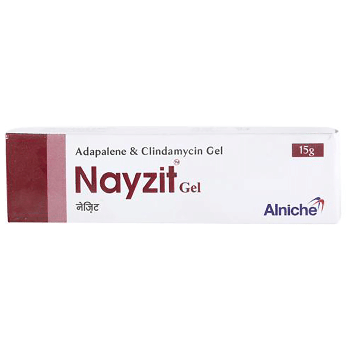 Nayzit Gel is a combination of two medicines that effectively treats acne. It minimizes oil production and helps to reduce inflammation. It also kills acne-causing microorganisms and prevents infection. This helps to prevent pimples, blackheads, and whiteheads on the skin. Nayzit Gel is only meant for external use and should be used as advised by your doctor. You should normally wash and dry the affected area before applying a thin layer of the medicine. It should not be applied to broken or damaged skin. Avoid any contact with your eyes, nose, or mouth. Rinse it off with water if you accidentally get it in these areas. It may take several weeks for your symptoms to improve, but you should keep using this medicine regularly. Do not stop using it as soon as your acne starts to get better. Ask your doctor when you should stop treatment. Side effects like minor itching, burning, or redness of the skin and oily skin may be seen in some people. These are usually temporary and resolve on their own. Consult your doctor if they bother you or do not go away. Inform your doctor if you have any problems with your bowels (intestines), or if you are using any other medicines to treat skin conditions. Consult your doctor about using this medicine if you are pregnant or breastfeeding.