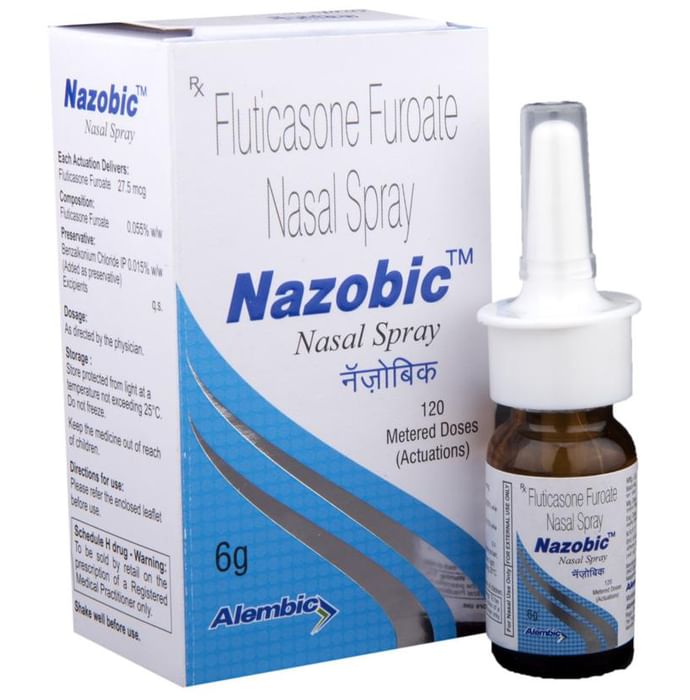 Nazobic Nasal Spray is a steroid. It relieves the symptoms of allergic rhinitis such as runny nose, sneezing and sinus discomfort. It works by blocking the production of certain chemical messengers that cause inflammation (swelling) and allergies, thus relieving the discomfort and irritation in your nose. You should always use it as advised by your doctor but to get the full benefit you should take it regularly. It may take a few days for the spray to take full effect. If you do not see an improvement in your symptoms after a week you should talk to your doctor. The most common side effects of Nazobic Nasal Spray include nasal discomforts such as burning or itching. It can also cause nosebleeds, nasal inflammation, and headaches in some patients. Talk to your doctor if you are worried about side effects or they do not go away. This medicine may lower the ability of your body to fight off infections, so try to stay away from someone having chickenpox, measles, or tuberculosis. In general, you should try to avoid situations which make your symptoms worse (things like pollen and dust mites), and it would be best to avoid smoking. Before starting to use this medicine you should let your doctor know if you are pregnant or breastfeeding, discuss the risks and benefits with your healthcare team. If you use this medicine for a long time, your doctor may want to carry out certain medical tests during the duration of treatment to check your progress.