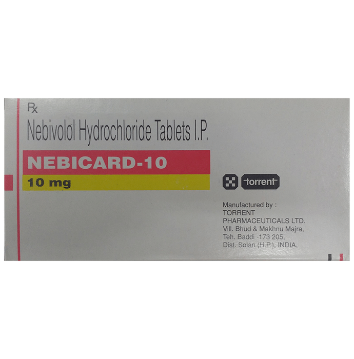 Nebicard 10 Tablet belongs to a group of medicines called beta-blockers. It is used to treat high blood pressure (hypertension). It also helps to prevent future heart attacks and stroke and to prevent migraines. Nebicard 10 Tablet is also used to relieve the symptoms caused by an overactive thyroid gland. It may be prescribed alone or together with other medications. The dose and frequency depend on what you are taking it for and the severity of your condition. It may be taken empty stomach or with a meal, but take it regularly at the same time each day to get the most benefit. It may take several weeks before you get the full benefit of this medicine and you may need to take it for the rest of your life. However, it is important to continue taking it even if you feel well. Most people with high blood pressure do not feel ill and if you stop taking it, your condition may worsen. Lifestyle changes like low-fat diet, exercise, and no smoking help to enhance the working of this medicine. The main side effects of this medicine are fatigue, headache, slow heart rate, feeling dizzy, and nausea. These are usually mild and short-lived. It may also cause shortness of breath or low blood pressure in some people. To reduce the risk of side effects your doctor will probably start the medicine at a low dose and gradually increase it. Consult your doctor if the side effects bother you or do not go away. Before taking it, let your doctor know if you have any liver problems. It may also not be suitable for people who have a slow heart rate, severe circulation problems, severe heart failure, or low blood pressure. Pregnant or breastfeeding mothers should also consult their doctor before taking it. You must talk to your doctor to find out whether this medicine is suitable for you to use. You should have your blood pressure checked regularly to make sure that this medicine is working properly. Avoid drinking alcohol as it may increase certain side effects.