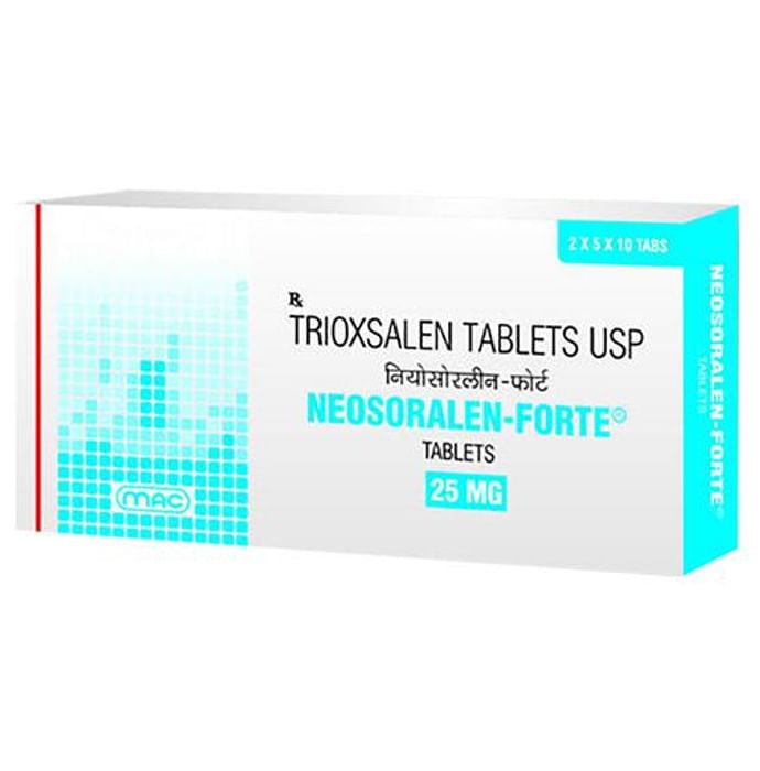 Neosoralen Forte 25mg Tablet is a medicine used in the treatment of vitiligo and psoriasis. It reduces the overproduction of skin cells and helps to re-pigment the discolored, white patches. Neosoralen Forte 25mg Tablet is taken after meals in a dose and duration as advised by the doctor. Taking with food helps to increase absorption of the medication as well as decrease nausea. The dose you are given will depend on your condition and how you respond to the medicine. You should keep taking this medicine for as long as your doctor recommends. If you stop treatment too early your symptoms may come back and your condition may worsen. Let your doctor know about all other medications you are taking as some may affect, or be affected by this medicine. The most common side effects of Neosoralen Forte 25mg Tablet are nausea, itching, and redness of the skin. Most of these are temporary and usually resolve with time. Contact your doctor straight away if you are at all concerned about any of these side effects. Taking this medicine makes the skin more sensitive to the sun. Use sunscreen and wear protective clothing when outdoors. Try to avoid exposure of your skin and lips to sunlight for eight hours after treatment. It is not recommended for children under the age of 14 years. Avoid eating certain foods like limes, figs, parsley, parsnips, mustard, carrots, and celery, as they may increase skin's sensitivity to light.
