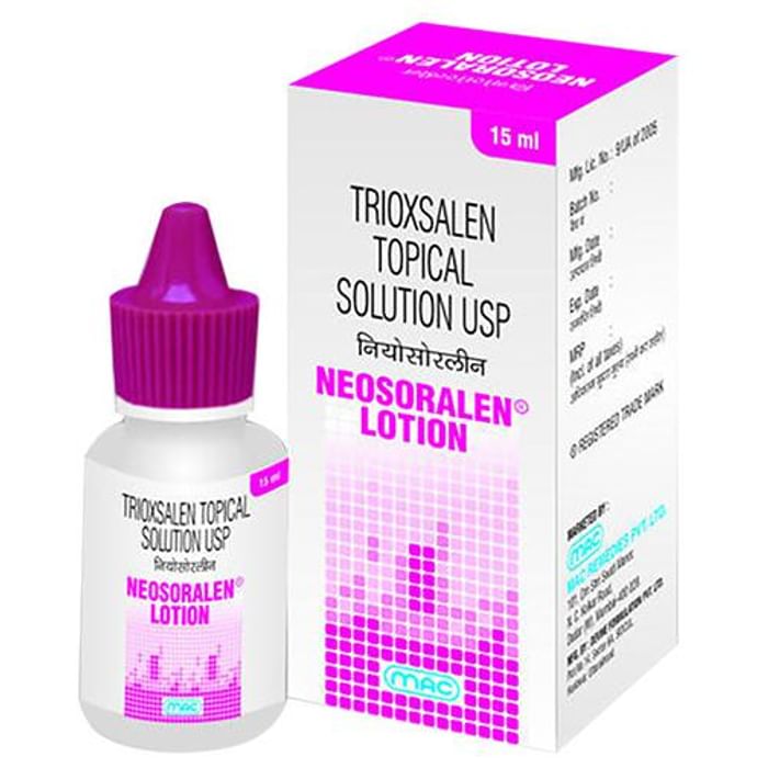 Neosoralen Lotion is a medicine used in the treatment of vitiligo and psoriasis. It reduces the overproduction of skin cells and helps to re-pigment the discolored, white patches. Neosoralen Lotion is for external use only. Use It only under the direct supervision of your doctor. The affected area should be clean and dry before application. You must wash your hands thoroughly before and after applying this medicine. This medicine should be used regularly to get the most benefit from it. Do not use more than you need as it will not clear your condition faster and some side effects may be increased. If your condition goes on for longer than four weeks or gets worse at any time, let your doctor know. You can help this medication work better by keeping the affected areas clean. Common side effects include burning, itching, irritation, and redness at the site of injection. It may also cause blisters on your skin. Please consult your doctor if these side effects persist for a longer duration. Avoid direct contact with your eyes. In case of accidental contact, wash your eyes with plenty of water and seek immediate medical attention. Application of Neosoralen Lotion can make your skin sensitive to sunlight. Avoid exposure to sunlight. Use sunscreens and cover yourself with protective clothing for at least 8 hours after treatment. Avoid eating certain foods like limes, figs, parsley, parsnips, mustard, carrots, and celery, as they may increase the skin's sensitivity to light.