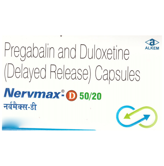 Nervmax-D 50/20 Capsule DR is used for the treatment of neuropathic pain. It decreases pain by controlling calcium channel activity of the nerve cells. It also increases the level of chemical messengers in the brain that helps maintain mental balance and stop the movement of pain signals in the brain. Nervmax-D 50/20 Capsule DR can be taken with or without food. However, it is advised to take it at the same time each day as this helps to maintain a consistent level of medicine in the body. Take this medicine in the dose and duration advised by your doctor as this is habit forming medicine. If you miss a dose of this medicine, take it as soon as you remember. Finish the full course of the treatment even if you feel better. It is important not to stop taking this medicine suddenly as it may worsen your symptoms. Some common side effects of this medicine include peripheral edema, nausea, headache, dryness of mouth, difficulty in concentration and blurred vision. It may cause dizziness and sleepiness, so do not drive or do anything that requires mental focus until you know how this medicine affects you. This medicine may cause weight gain and to control it, you should have a balanced diet and exercise regularly. It is important to inform your doctor if you develop any unusual changes in mood or behavior, new or worsening depression, or suicidal thoughts. Before taking this medicine let your doctor know if you suffer from kidney or liver disease. Your doctor should also know about all other medicines you are taking as many of these may make this medicine less effective or change the way it works. Inform your doctor if you are pregnant, planning pregnancy or breastfeeding.