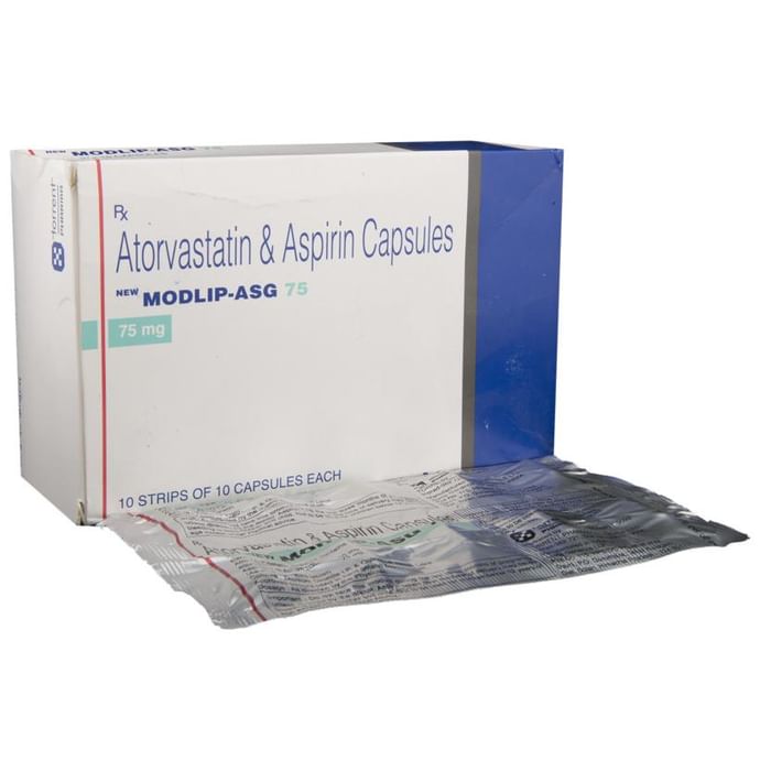 In Treatment of Prevention of heart attack and stroke New Modlip-Asg 75 Capsule is a combination medicine that is used to prevent heart attack. It contains Atorvastatin that works by reducing the amount of “bad” cholesterol (LDL) and raising the amount of “good” cholesterol (HDL) in your blood. High levels of cholesterol can cause your blood vessels to narrow (atherosclerosis). Lowering the amount of cholesterol reduces the chances of heart diseases and stroke and helps you remain healthier for longer. Besides, it also contains a blood thinner, Aspirin, that prevents the formation of blood clots and also prevents the existing ones from growing bigger in size. Take it regularly and make appropriate lifestyle changes (such as eating healthy and staying active) to maximize the effectiveness of this medicine. Keep taking it even if you feel well.