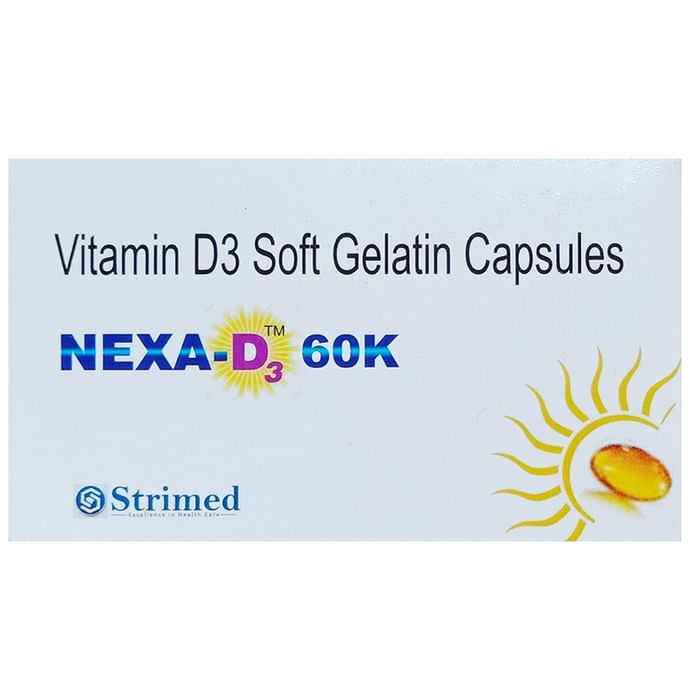 Nexa-D3 60K Soft Gelatin Capsule is used in the treatment of vitamin D deficiency and osteoporosis. It helps the body to absorb calcium. Calcium is essential for maintaining strong and healthy bones. it is used when your diet does not provide enough. Nexa-D3 60K Soft Gelatin Capsule should be taken as directed by your doctor. It is best taken with or after food as this helps your body absorb it and you should take it regularly to get the most benefit. If you are using it to treat osteoporosis you will be prescribed other medicines as well. This medicine may be only part of a complete program of treatment that also includes making changes to your diet and taking calcium and vitamin supplements. Learn about the foods you should eat to make sure you get enough calcium and vitamin D in your diet. Nexa-D3 60K Soft Gelatin Capsule has few side effects and none are common. If you take too much you may feel weakness, muscle pain, or have a metallic taste in your mouth. If experience any such side effects, speak with your doctor. They may be able to help you reduce or treat the symptoms. Before taking this medicine, tell your doctor if you have high levels of calcium in your blood or if you have any heart, kidney, or liver disease. Some other medicines can decrease the absorption of vitamin D3 so let your doctor know all other medicines you are taking to make sure you are safe. This medicine may help during pregnancy when your body needs more vitamin D but too much could harm your baby. Discuss with your doctor.