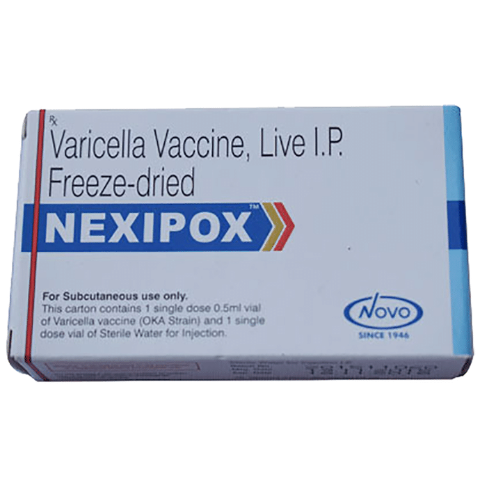 Nexipox Vaccine is indicated for active immunization for prevention of chickenpox in individuals 12 months of age and older. It is generally given as an injection under the skin or into the muscle of the upper arm in two doses. Nexipox Vaccine is administered by a healthcare professional and should not be self-administered. It protects the child from diseases that can be caused by the varicella virus. It is given to children between 12 months to 12 years of age and the second dose after a minimum gap of 3 months. For adolescents and adults as well, it is given in two doses a minimum of 4 weeks apart. Some common side effects of this medicine include mild pain, swelling, and redness at the site of injection, rashes, and low-grade fever. These are usually temporary and resolve with time. However, if these side effects do not go away with time or get worse, let the doctor know. The doctor may help with ways to reduce or prevent these symptoms. To make sure the vaccine is safe, before receiving the vaccine, it is important to let the doctor know if you have any other illnesses. You should also tell the doctor about all the medicines you are taking. Pregnant and breastfeeding mothers should consult and seek advice from their doctor before receiving the vaccine.