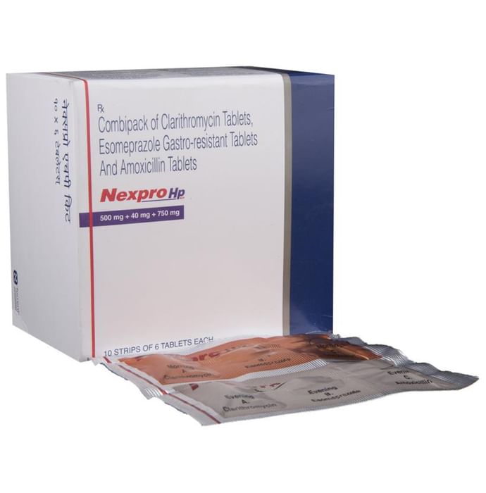 Nexpro HP Combipack is a combination of two antibiotics and an antacid that effectively treats peptic ulcer disease caused due to H. pylori bacterial infection. It fights against the bacteria to treat the infection. It also relieves acidity and discomfort related to the infection. Nexpro HP Combipack is a prescription medicine. It is advised to take it as per the prescription. It should be taken in an empty stomach, but it must be taken at a fixed time to ensure better efficacy. Do not consume more than the recommended dose, as this may have harmful effects on your body. If you miss a dose, take it as soon as you remember. The treatment must be completed even if you feel better. The common side effects of this medicine are nausea, vomiting, diarrhea, rashes, etc. If any of the side effects get aggravated, you must consult your doctor immediately. If you experience any allergic reaction (rashes, itching, swelling, shortness of breath, etc.), you must seek immediate medical help. Before taking this medicine, you should tell your doctor if you are taking any medicines for any health condition. Pregnant or breastfeeding women should also consult with their doctor before taking it. Avoid drinking alcohol as it can cause excessive drowsiness with this medicine. It usually does not impair your ability to drive, but you should not drive if it makes you feel sleepy or dizzy.