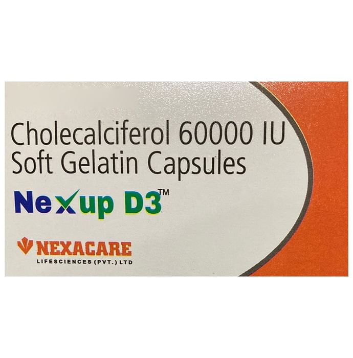 Nexup D3 Soft Gelatin Capsule is used in the treatment of vitamin D deficiency and osteoporosis. It helps the body to absorb calcium. Calcium is essential for maintaining strong and healthy bones. it is used when your diet does not provide enough. Nexup D3 Soft Gelatin Capsule should be taken as directed by your doctor. It is best taken with or after food as this helps your body absorb it and you should take it regularly to get the most benefit. If you are using it to treat osteoporosis you will be prescribed other medicines as well. This medicine may be only part of a complete program of treatment that also includes making changes to your diet and taking calcium and vitamin supplements. Learn about the foods you should eat to make sure you get enough calcium and vitamin D in your diet. Nexup D3 Soft Gelatin Capsule has few side effects and none are common. If you take too much you may feel weakness, muscle pain, or have a metallic taste in your mouth. If experience any such side effects, speak with your doctor. They may be able to help you reduce or treat the symptoms. Before taking this medicine, tell your doctor if you have high levels of calcium in your blood or if you have any heart, kidney, or liver disease. Some other medicines can decrease the absorption of vitamin D3 so let your doctor know all other medicines you are taking to make sure you are safe. This medicine may help during pregnancy when your body needs more vitamin D but too much could harm your baby. Discuss with your doctor.