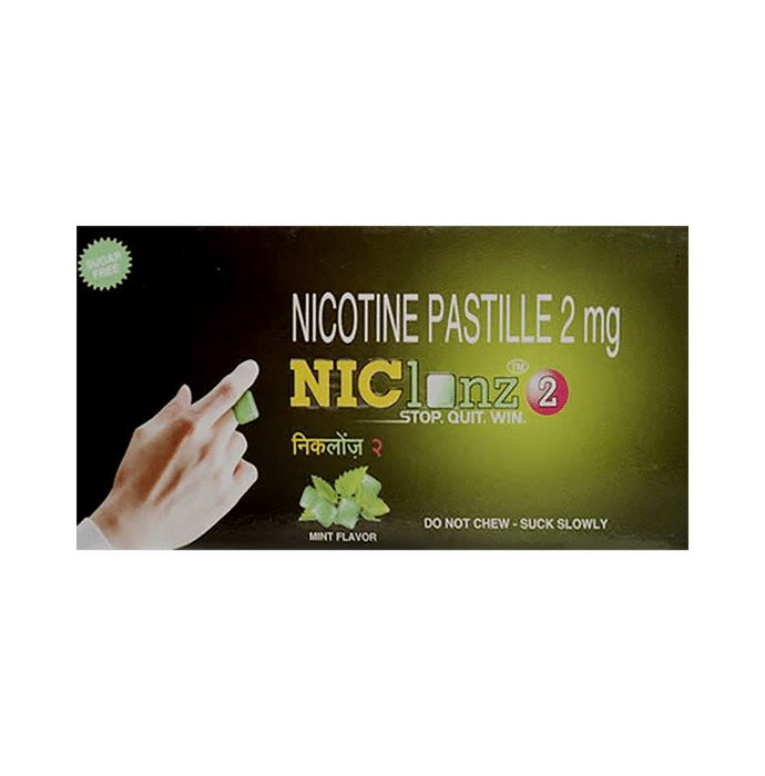In Quitting smoking Tobacco contains the substance nicotine which is extremely addictive. Niclonz 4 Pastilles Mint Sugar Free is a form of nicotine replacement therapy (NRT). It contains nicotine but not the other toxic chemicals in tobacco smoke such as tar and carbon monoxide. It may be used to help you quit smoking and reduce the unpleasant withdrawal effects and cravings that often occur when you stop smoking. This medicine has worked very well for many years to help people stop smoking and is even more effective if you have other support such as counseling. This treatment may take several weeks to work so you need to continue until you have been successful. Quitting smoking is extremely hard and requires you to change your behaviors but it has a huge range of health benefits and dramatically improves your quality of life.
