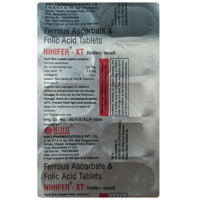 Nihifer-XT Tablet is a combination of two medicine used for treatment of iron deficiency and anemia. It helps the body make healthy new cells and maintain iron level in the blood. Nihifer-XT Tablet can be taken with or without food. Take it regularly and at the same time each day to get the most benefit. The dose and how often you take it depends on what you are taking it for. Your doctor will decide how much you need to improve your symptoms. Continue taking the medicine for as long as it is prescribed for you. Nausea, vomiting, and stomach upset are some common side effects of this medicine. If these bother you or appear serious, let your doctor know. There may be ways of reducing or preventing them. Usually, it is suggested to avoid alcohol while taking this medicine. Let your doctor also know about all the other medicines you are taking as many of these may make this medicine less effective or change the way it works.