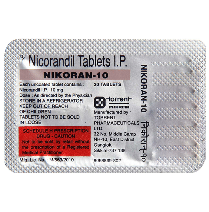 Nikoran 10 Tablet is a medicine used to prevent and treat heart-related chest pain (angina). It is usually prescribed when other heart medicines are either not suitable or have not worked. It reduces the risk of an angina attack by widening blood vessels and improving blood flow to the heart. Nikoran 10 Tablet may be taken with or without food. It should be swallowed whole with water. Take this medicine regularly and at about the same time(s) each day. Your doctor will decide the dose and how often you should take it. This may change from time to time depending on how well it is working. Do not stop taking it without talking to our doctor as sudden withdrawal may cause your chest pain to come back. You can improve the health of your heart by making some lifestyle changes such as quitting smoking, cutting down on alcohol, eating well, exercising regularly, and managing stress. The most common side effect of this medicine is headache, especially during the first few days of treatment. This usually improves within a week. However, drinking plenty of fluids and avoiding alcohol may help. Other common side effects include dizziness or weakness, nausea, and flushing (sense of warmth in the face, ears, neck, and trunk). Talk to your doctor if these bother you or do not go away. Nikoran 10 Tablet may not be suitable for some people. Inform your doctor if you have a history of low blood pressure or heart failure. Also let your doctor know about all other medications that you are using as some may affect, or be affected by this medicine. You should not take any medicines for erectile dysfunction with this medicine. Nikoran 10 Tablet is not usually recommended during pregnancy or breastfeeding.
