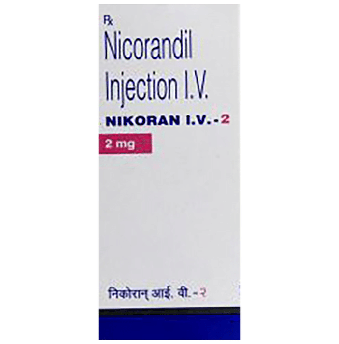 Nikoran 2mg Injection is a medicine used to prevent and treat heart-related chest pain (angina). It is usually prescribed when other heart medicines are not suitable or have not worked. It reduces the risk of an angina attack by widening blood vessels and improving blood flow to the heart. Nikoran 2mg Injection is administered under the supervision of a healthcare professional and should not be self administered. Your doctor will decide the dose and how often you should take them. Your doctor is likely to prescribe you oral medicines after the treatment with this medicine. You can improve the health of your heart by making some lifestyle changes such as quitting smoking, cutting down on alcohol, eating well, taking exercising regularly and managing stress. The most common side effect of this medicine is headache, especially during the first few days of treatment. You can reduce this by drinking plenty of fluids and avoiding alcohol, but it usually goes after a week. Other common side effects include ulcer, feeling dizzy or weak, nausea and vomiting, palpitation, and flushing (sense of warmth in the face, ears, neck and trunk). Talk to your doctor if these bother you or do not go away. Nikoran 2mg Injection is not suitable for some people. Tell your doctor if you have low blood pressure, a problem with fluid in your lungs or kidney problems. Also let your healthcare team know all other medications you are using as some may affect, or be affected by this medicine. You should not take any medicines for erectile dysfunction with this medicine. This medicine is not usually recommended during pregnancy or breastfeeding. Drinking alcohol can increase the blood pressure-lowering effect of Nikoran 2mg Injection. Your doctor may ask you to avoid salt substitutes.