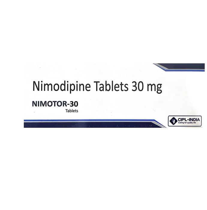 Nimotor 30 Tablet is a medicine used to treat and prevent further damage to the brain after bleeding around the brain (subarachnoid hemorrhage or SAH). It is known as a calcium channel blocker and helps to improve blood flow to the brain and prevent changes in brain function. Nimotor 30 Tablet is usually started as soon as possible after bleeding around the brain (or SAH) is confirmed by the doctor. The exact dose and frequency will be decided by your doctor depending on your medical condition and response to treatment. It may be taken empty stomach or with a meal, but take it regularly as per your doctor’s instructions, to get the most benefit. Do not take any antacids for 2 hours before or after taking Nimotor 30 Tablet as this can prevent the medicine from working properly. Do not stop taking this medicine without first consulting your doctor. Your condition may worsen if this medicine is stopped too soon. The most common side effects include decreased blood pressure, increased heart rate (tachycardia), headache, stomach discomfort, nausea, rash, muscle cramp, and edema (swelling over the whole body). Consult your doctor If any of these bother you, or get worse, or do not go away. Before taking Nimotor 30 Tablet, let your doctor know if you have any heart or liver-related problems. Some other medicines may affect the way it works, especially some medicines used to treat seizures (fits) and those used to treat high blood pressure or heart conditions. Please tell your doctor about all the medicines you are taking to make sure you are safe. Pregnant or breastfeeding women should also consult their doctor for advice before taking this medicine. Your doctor will keep a watch on your blood pressure while you are taking this medicine.