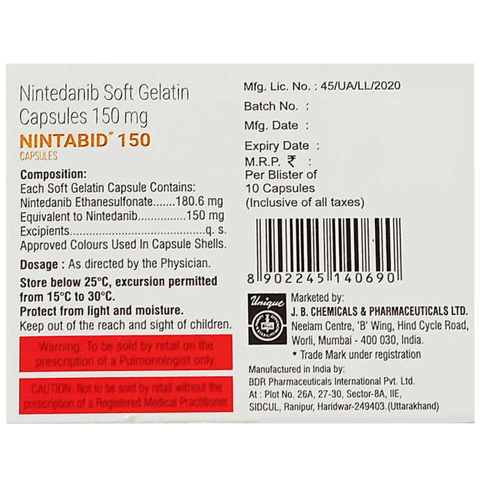 In Idiopathic pulmonary fibrosis Idiopathic pulmonary fibrosis is a lung disease caused by lung tissue becoming thick and stiff and eventually forming scar tissue within the lungs. The scarring, or fibrosis, seems to result from a cycle of damage and healing that occurs in the lungs. These changes are irreversible and the affected person may experience shortness of breath or dry cough as initial symptoms. Nintabid 150 Soft Gelatin Capsule kills or stops the growth of cancer cells and also prevents the multiplication of cancer cells. You may experience some bothersome side effects. Discuss with your doctor if you have any doubts. In Non-small cell lung cancer Non-small cell lung cancer is one of the major kinds of lung cancer and it affects both smokers as well as non-smokers. Nintabid 150 Soft Gelatin Capsule helps treat non-small cell lung cancer and may be given alone or in combination with other medicines. It is a potent and very toxic medicine and you should discuss the risks and benefits with your doctor. You should avoid drinking alcohol while having this treatment and drink plenty of water to stay hydrated.