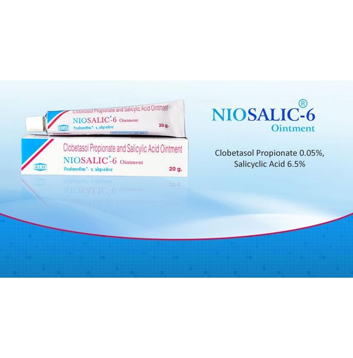 Niosalic 6 Ointment has a combination of medicines that are used to treat eczema and psoriasis. It helps to provide relief from redness, itching, and swelling. It removes dead skin cells and helps in softening the skin. Niosalic 6 Ointment should be used in the dose and duration as advised by your doctor. Wash your hands before using this medicine. It is advised to check the label for directions before use. It is for external use only. Do not use this medicine more than the recommended dose. Inform your doctor if you have known allergies to this medicine. The common side effects of this medicine include peeling of the skin, thinning of the skin, burning, itching, irritation, and redness at the application site. If these side effects or any other symptoms which you think are because of this medicine persist for a longer duration, please consult your doctor. Inform your doctor if you are pregnant or are suffering from any other disease. This medicine is safe to use in breastfeeding mothers.