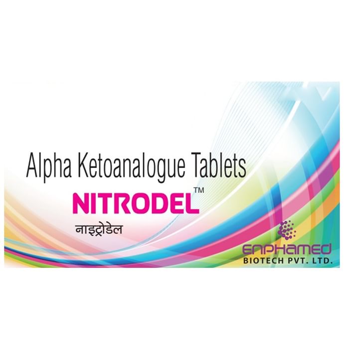 Nitrodel Tablet is a nutritional supplement used in the treatment of chronic kidney disease. It reduces urea levels in the blood and helps prevent the progression of kidney disease. This way it delays the risk of undergoing long-term dialysis. Nitrodel Tablet is to be taken by mouth with or without food. Take it in the exact dose and duration as advised by the doctor. Taking it along with a low-protein diet may help get the best of the medicine. Ensure that you maintain adequate calorie intake during treatment. While you are taking this medicine, your doctor may advise regular monitoring of serum calcium levels. This medicine is usually well tolerated with no common side effects. Ensure regular doctor consultation to evaluate medicine effects on your body. Before taking Nitrodel Tablet, it is important to tell your doctor if you are taking any other medicines for other health conditions.