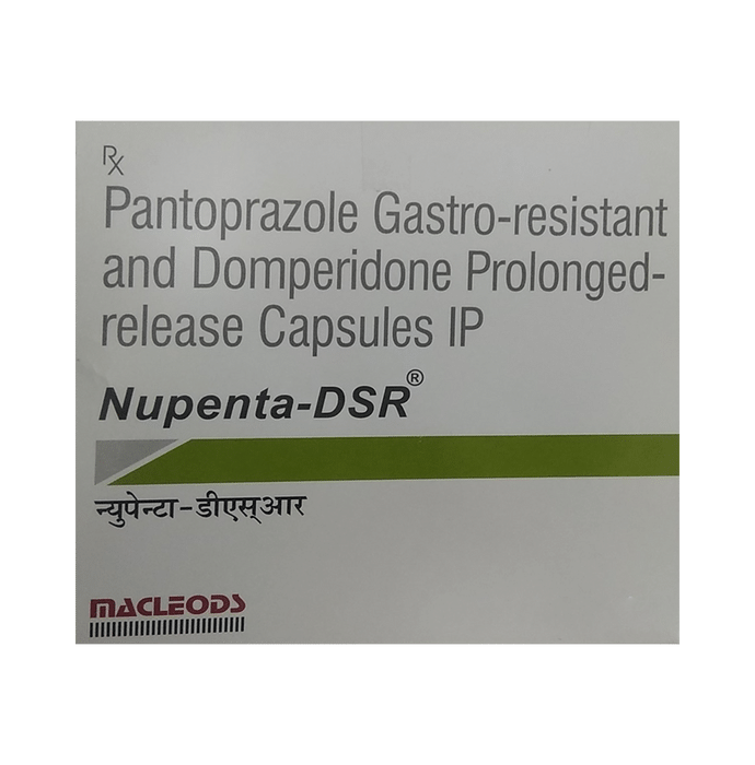 Nupenta-DSR Capsule is a prescription medicine used to treat gastroesophageal reflux disease (Acid reflux) and peptic ulcer disease by relieving the symptoms of acidity such as indigestion, heartburn, stomach pain, or irritation. Nupenta-DSR Capsule also neutralizes the acid in the stomach and promotes easy passage of gas to reduce stomach discomfort. It is taken without food in a dose and duration as advised by the doctor. The dose you are given will depend on your condition and how you respond to the medicine. You should keep taking this medicine for as long as your doctor recommends. If you stop treatment too early your symptoms may come back and your condition may worsen. Let your healthcare team know about all other medications you are taking as some may affect, or be affected by this medicine. The most common side effects are diarrhea, stomach pain, flatulence, dryness in the mouth, and headache. Most of these are temporary and usually resolve with time. Contact your doctor straight away if you are at all concerned about any of these side effects. This medicine may cause dizziness and sleepiness, so do not drive or do anything that requires mental focus until you know how this medicine affects you. Avoid drinking alcohol while taking this medicine as it can worsen your sleepiness. Lifestyle modifications like having cold milk and avoiding hot tea, coffee, spicy food, or chocolate can help you to get better results. Before you start taking this medicine it is important to inform your doctor if you are suffering from kidney or liver disease. You should also tell your doctor if you are pregnant, planning pregnancy, or breastfeeding.