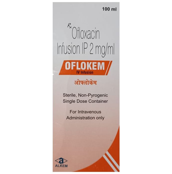 Oflokem 2mg Infusion is an antibiotic, used in the treatment of bacterial infections. It is also used in treating infections of the urinary tract, nose, throat, skin and soft tissues, and lungs (pneumonia). It cures the infection by stopping further growth of the causative microorganisms. Oflokem 2mg Infusion is given as an injection into a vein (intravenous), in cases where oral administration is not possible, such as in hospitalized or unconscious patients. It is administered by a healthcare professional. Kindly do not self-administer. Avoid skipping any doses and finish the full course of treatment even if you feel better. Some people may have nausea, headache, dizziness, and vomiting as side effects of this medicine. You may also notice some injection site reactions like pain, swelling, or redness. These are usually temporary and resolve on their own, but please consult your doctor if these side effects persist for a longer duration. Diarrhea may also occur as a side effect but should stop when your course is complete. Inform your doctor if it does not stop or if you find blood in your stools. You should not take this medicine if you are allergic to any of its ingredients. Rarely, some people may have a severe allergic reaction that needs urgent medical attention. Signs of this include rash, swelling of the lips, tongue, or face, shortness of breath, or breathing problems. Special care should be taken in people with kidney problems while taking this medicine.