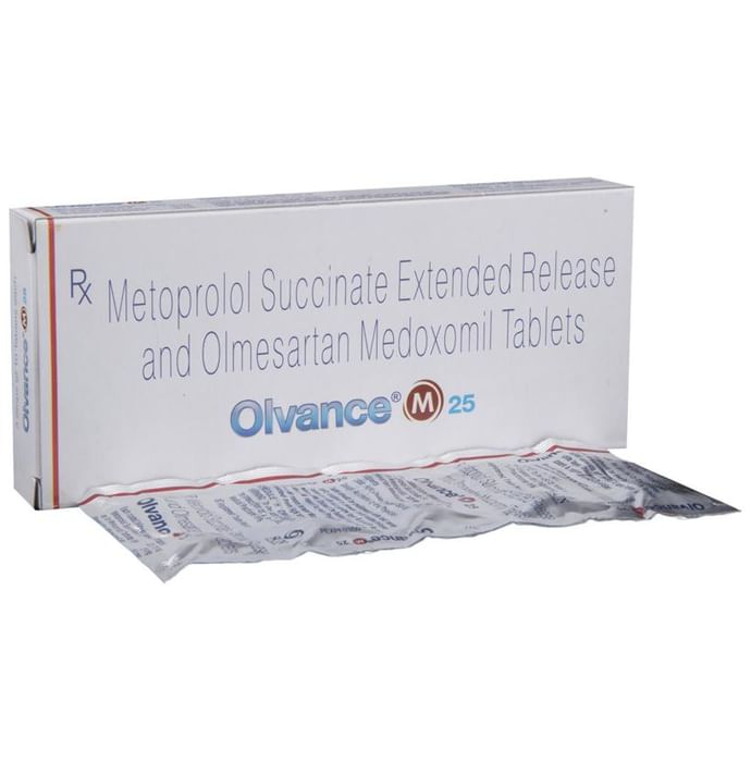 In Hypertension (high blood pressure) Olvance M 25 Tablet is a combination medicine that contains two active ingredients, Amlodipine and Metoprolol Succinate. Both of the medicines in this combination work to lower blood pressure but in different ways. Together they help to relax blood vessels, reduce heart rate and make it easier for your heart to pump blood around your body. This lowers blood pressure. If your blood pressure is controlled you are less at risk of having a heart attack, stroke or kidney problems. The medicine must be taken regularly as prescribed to be effective. You do not usually feel any direct benefit from taking this medicine, but it works in the long term to keep you well. You should also make appropriate lifestyle changes (such as eating healthy and staying active) to maximize the effectiveness of this medicine.