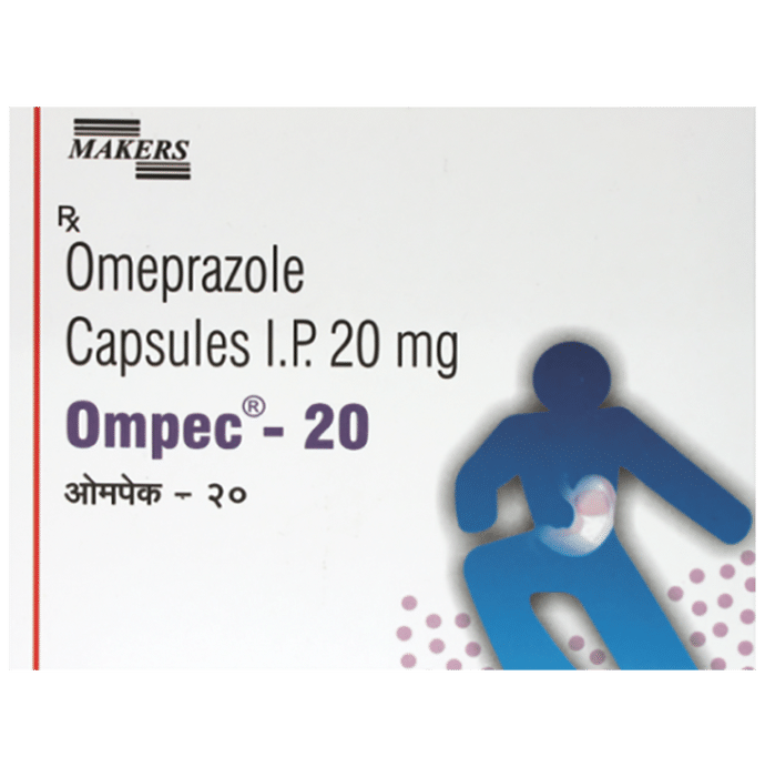 Ompec 20 Capsule is a medicine that reduces the amount of acid produced in your stomach. It helps treat acid-related diseases of the stomach and intestine such as heartburn, acid reflux, and peptic ulcer disease. Ompec 20 Capsule is also used to prevent stomach ulcers and acidity that may be seen with the prolonged use of painkillers. It belongs to a class of medicines known as proton pump inhibitors (PPIs). This medicine should be taken one hour before a meal, preferably in the morning. The dose will depend on your underlying condition and how you respond to the medicine. You should keep on taking it as prescribed even if your symptoms disappear quickly. You can increase the efficiency of the treatment by eating smaller meals more often and avoiding caffeinated drinks (like tea and coffee), and spicy or fatty foods. The most common side effects observed with this medicine include nausea, vomiting, headache, flatulence, diarrhea, and stomach pain. These symptoms are generally mild but if they bother you or do not go away, consult your doctor. Long-term use of this medicine may lead to an increased risk of side effects. For instance, using this medicine for more than 1 year may increase your risk for bone fractures, especially with higher doses. Talk to your doctor about ways to prevent bone loss (osteoporosis). Before taking this medicine, let your doctor know if you have or had severe liver problems, allergic reactions to similar medicines, or bone loss (osteoporosis). Many other medicines may affect, or be affected by, this medicine. Let your doctor know about all other medicines you are taking, to make sure it is safe. This is particularly important if you are taking medicines for HIV, fungal infections, tuberculosis, epilepsy (fits), or some types of blood thinners. Pregnant or breastfeeding women should also consult their doctor before taking this medicine.