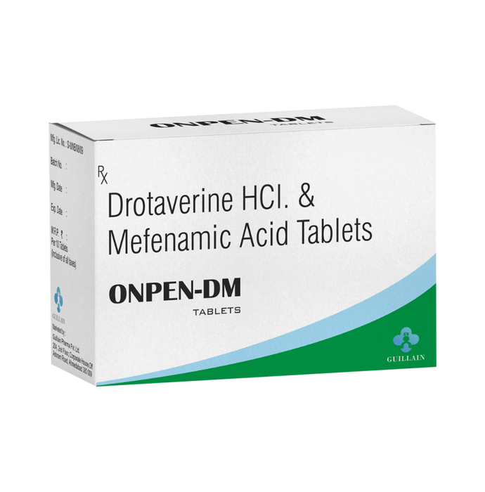 Onpen-DM Tablet is a combination medicine used in the treatment of abdominal pain. It works effectively to reduce abdominal pain, bloating, discomfort and cramps by relaxing the muscles of the stomach and gut. It also blocks certain chemical messengers that cause pain and discomfort. Onpen-DM Tablet is taken with food in a dose and duration as advised by the doctor. The dose you are given will depend on your condition and how you respond to the medicine. You should keep taking this medicine for as long as your doctor recommends. If you stop treatment too early your symptoms may come back and your condition may worsen. Let your healthcare team know about all other medications you are taking as some may affect, or be affected by this medicine. The most common side effects are diarrhea, nausea, vomiting, stomach pain, dryness in mouth, loss of appetite, feeling thirsty, and heartburn. Most of these are temporary and usually resolve with time. Contact your doctor straight away if you are at all concerned about any of these side effects. It may also cause dizziness and drowsiness, so do not drive or do anything that requires mental focus until you know how this medicine affects you. Avoid drinking alcohol while taking this medicine as it can worsen your dizziness. Before taking this medicine, you should tell your doctor if you are pregnant, planning pregnancy or breastfeeding. You should also tell your doctor if you have any kidney or liver diseases so that your doctor can prescribe a suitable dose for you.