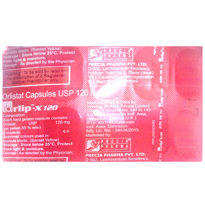 Orlip X 120mg Capsule is a medicine used in the treatment of obesity. It helps the body in blocking the absorption of fats from the small intestines and stomach. Orlip X 120mg Capsule should be taken along with food in the dose and duration as per prescription. It must be swallowed as a whole. It works best when it is used along with regular physical activity and a healthy diet. It should not be taken for a long term unless your doctor tells you to do so. For better efficacy of the medicine, fat-rich foods should be avoided along with the medicine. Some of the common side effects of Orlip X 120mg Capsule include the presence of fat in the stool, abdominal pain, and diarrhea. If any of the side effects bother you, tell your doctor without delay. Pregnant and breastfeeding women must take this medicine only with a valid prescription. Inform your doctor before taking the medicine if you have any other medical conditions or are taking any other medications. This medicine should not be considered as a long-term treatment unless you are prescribed by your doctor.