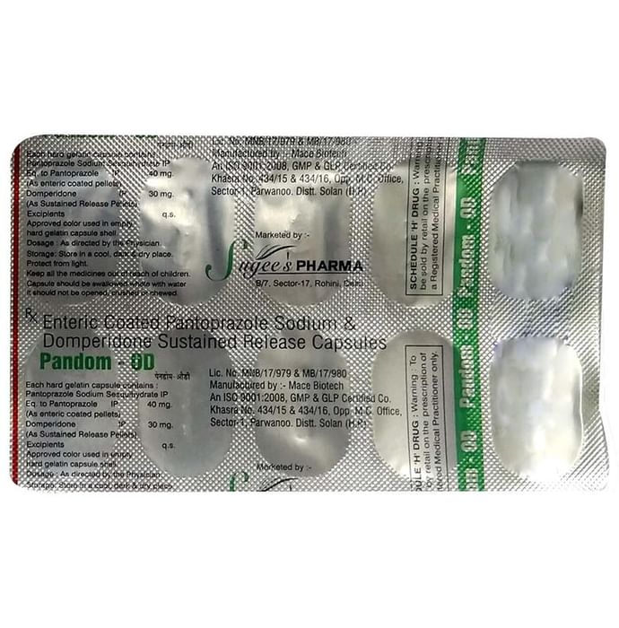 In Treatment of Gastroesophageal reflux disease (Acid reflux) Gastroesophageal reflux disease (GERD) is a chronic (long-term) condition in which there is an excess production of acid in the stomach. Pandom-OD Capsule SR reduces the amount of acid your stomach makes and relieves the pain associated with heartburn and acid reflux. You should take it exactly as it is prescribed for it to be effective. Some simple lifestyle changes can help reduce the symptoms of GERD. Think about what foods trigger heartburn and try to avoid them; eat smaller, more frequent meals; try to lose weight if you are overweight, and try to find ways to relax. Do not eat within 3-4 hours of going to bed. In Treatment of Peptic ulcer disease Peptic ulcer disease is a condition in which painful sores or ulcers develop in the inner lining of the stomach or gut (intestine). Pandom-OD Capsule SR reduces the amount of acid your stomach makes which prevents further damage to the ulcer as it heals naturally. You may be given other medicines along with this medicine depending on what caused the ulcer. You need to keep taking the medicine as it is prescribed for it to be effective, even if the symptoms seem to disappear.