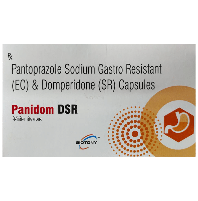 Panidom DSR Capsule is a prescription medicine used to treat gastroesophageal reflux disease (Acid reflux) and peptic ulcer disease by relieving the symptoms of acidity such as indigestion, heartburn, stomach pain, or irritation. Panidom DSR Capsule also neutralizes the acid in the stomach and promotes easy passage of gas to reduce stomach discomfort. It is taken without food in a dose and duration as advised by the doctor. The dose you are given will depend on your condition and how you respond to the medicine. You should keep taking this medicine for as long as your doctor recommends. If you stop treatment too early your symptoms may come back and your condition may worsen. Let your healthcare team know about all other medications you are taking as some may affect, or be affected by this medicine. The most common side effects are diarrhea, stomach pain, flatulence, dryness in the mouth, and headache. Most of these are temporary and usually resolve with time. Contact your doctor straight away if you are at all concerned about any of these side effects. This medicine may cause dizziness and sleepiness, so do not drive or do anything that requires mental focus until you know how this medicine affects you. Avoid drinking alcohol while taking this medicine as it can worsen your sleepiness. Lifestyle modifications like having cold milk and avoiding hot tea, coffee, spicy food, or chocolate can help you to get better results. Before you start taking this medicine it is important to inform your doctor if you are suffering from kidney or liver disease. You should also tell your doctor if you are pregnant, planning pregnancy, or breastfeeding.