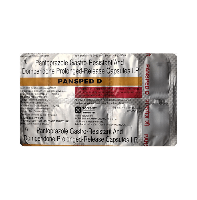 In Treatment of Gastroesophageal reflux disease (Acid reflux) Gastroesophageal reflux disease (GERD) is a chronic (long-term) condition in which there is an excess production of acid in the stomach. Pansped D Capsule PR reduces the amount of acid your stomach makes and relieves the pain associated with heartburn and acid reflux. You should take it exactly as it is prescribed for it to be effective. Some simple lifestyle changes can help reduce the symptoms of GERD. Think about what foods trigger heartburn and try to avoid them; eat smaller, more frequent meals; try to lose weight if you are overweight, and try to find ways to relax. Do not eat within 3-4 hours of going to bed. In Treatment of Peptic ulcer disease Peptic ulcer disease is a condition in which painful sores or ulcers develop in the inner lining of the stomach or gut (intestine). Pansped D Capsule PR reduces the amount of acid your stomach makes which prevents further damage to the ulcer as it heals naturally. You may be given other medicines along with this medicine depending on what caused the ulcer. You need to keep taking the medicine as it is prescribed for it to be effective, even if the symptoms seem to disappear.